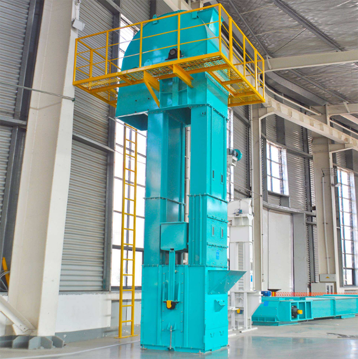 當場地受限或需要大高度提升時,采用斗式提升機方案。礦渣水泥廢料由螺旋或皮帶給料機送入斗式提升機底部,提升高度可達 15~30 m,額定輸送能力 120~160 t/h。提升至頂部后,經密閉卸料口落入平臺上的緩沖倉,再通過可擺動控制的卸料溜槽直接裝車。可在溜槽出口設除塵接口并采用軟密封套筒,防止裝車時粉塵外溢。